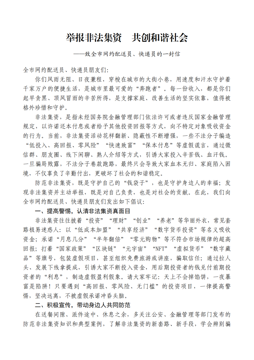 防范非法集资,既是守护自己的“钱袋子”,也是守护身边人的幸福;发现非法集资并主动举报,既是对自己负责,也是对社会的贡献。在此,我们向全市网约配送员、快递员朋友们发出如下倡议: