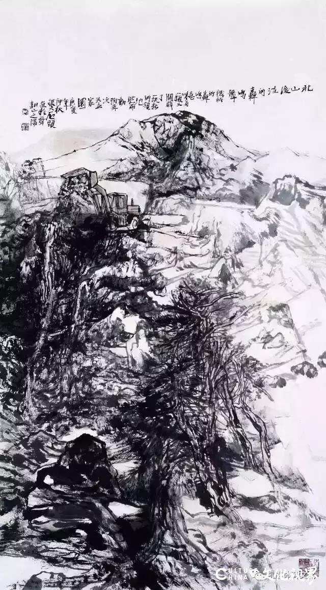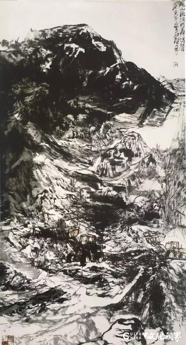 以作品《北山后洼的轰鸣声》为例,人类之所以能在地球上安居乐业,首要条件是生态环境的平衡,而这一点往往为一味追求物质享受的人类所忽视,《北山后洼的轰鸣声》中题:“机器的轰鸣,意味着人类又开辟了一块新的领地,然而动物却再次失去家园。”轰鸣的推土机,已非上世纪中下叶山水画中翻身民众战天斗地的豪迈气息,也不是对人类征服自然、主宰世界赞美,而是对人性贪婪带来悲剧性绝望的一声叹息,此时,人的坚韧、顽强、不屈显然已被悲恸、麻木、漠然所替代,物质的富足与精神的缺失得到了微观清晰的显现,无论是“为祖国山河立传”还是“为自然环境呐喊”,都是画家对人性救赎的一种考量,在直指善与恶的思辨中,也在反思人类存在的价值与本意到底是什么。