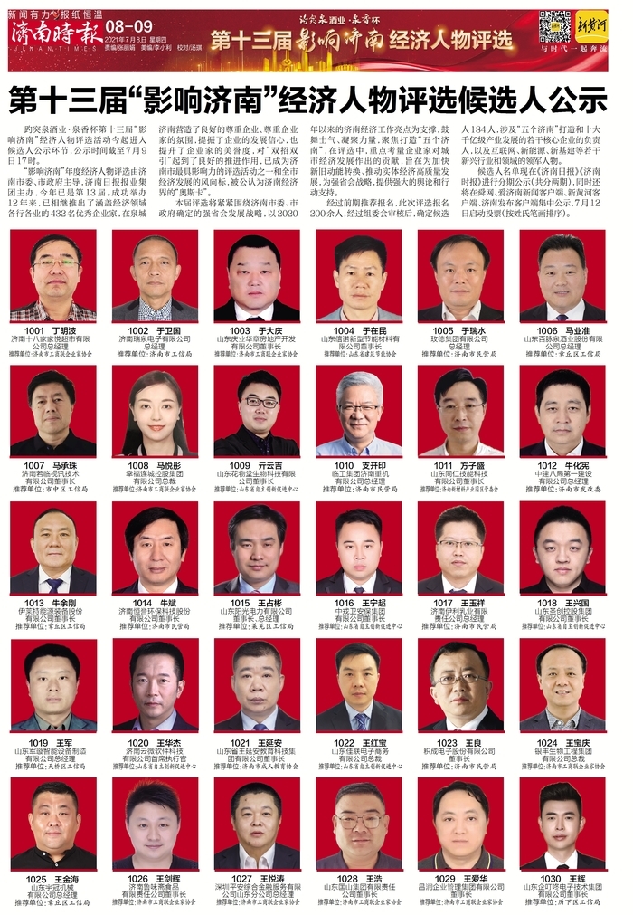 趵突泉酒业·泉香杯第十三届“影响济南”经济人物评选活动今起进入候选人公示环节,公示时间截至7月9日17时。
