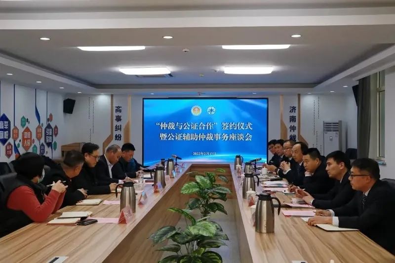 为加强相互间交流合作,充分发挥仲裁与公证各自制度优势,提升公共法律服务水平,2月17日下午,济南仲裁委与泉城公证处共同组织“仲裁与公证”合作签约仪式暨公证辅助仲裁事务座谈会,开启了省内仲裁机构与公证行业合作的先河。济南仲裁办党组成员、副主任刘昌国、一级调研员王青,济南市泉城公证处主任赵毅、副主任白晓及双方相关业务负责人出席活动。