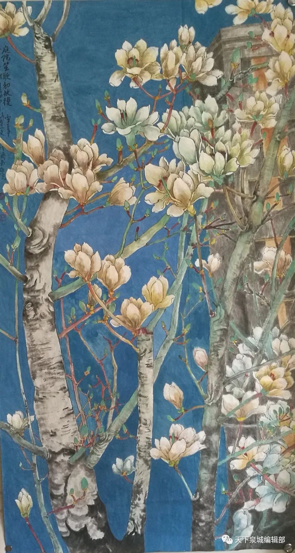 他说,只有以自然为师,作品才会得自然之美,呈自然之趣,显自然之魂。为此,他几十年如一日地坚持写生,“我喜欢写生,因为写生能看到动植物本质的变化”。就像他的代表作《争春》,里面有光与影的艺术,有开与合的艺术,有浓与淡的艺术,还有大自然的蓬勃生机和动植物生命的活力。“这都是写生时的所见、所感,比如玉兰花未开时,是毛绒绒的状态,盛开后花瓣是绵绵的;在阳光的照射下,不同的花朵形态、枝干部位等明暗度也是不同的;平视玉兰树和仰视玉兰树的感受也是不同的。我在写生时画了很多速写,回来后再加入自己的理解进行构思创作。包括用蓝底子衬托出玉兰花的奔放之感,用黄鹂鸟和蝴蝶在林间的状态让画面更生动,以及林后的山间、河流等,皆是为了让这幅作品回归自然又高于自然。”