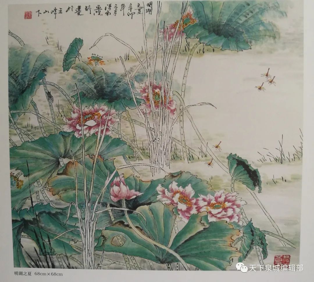在他的笔下,展翅高飞的大雁、恬静悠然的鹈鹕、含苞待放的玉兰、亭亭玉立的荷花等皆得到淋漓尽致地展现。画家林凡观其花鸟画后写下“清风河上,山花未谢,潮月林间,寒雁飞来”的评语。