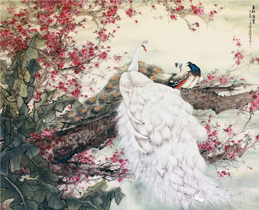 两只孔雀,一绿一白,相对而立,栖息在一棵苍老树干上,芭蕉叶和红杜鹃映衬在旁,整个画面栩栩如生,如梦如幻。这是济南画院专业画家舒大文的精品力作《玉羽凌云》,悬挂于中南海玉泉山常委会议室。