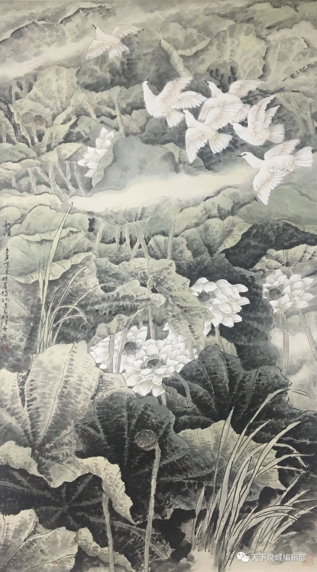 确是如此。他的作品中,有很大篇幅是六尺或八尺的中堂巨制。笔墨气韵酣畅淋漓,下笔沉着、挥洒自如、一气呵成,也显示出他驾驭大幅画作的能力。“画大画不发憷、不打稿,这是我的特点,因为我年轻时在电影院画了十多年电影海报,并且是短短几日内就要完工,这给我打下了扎实的大画基础。”