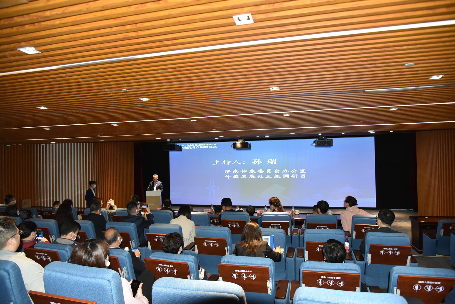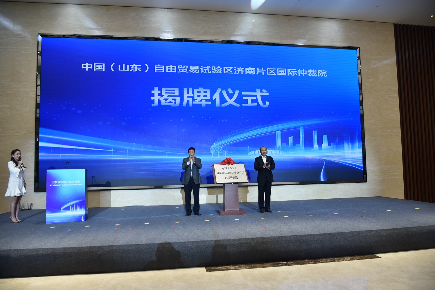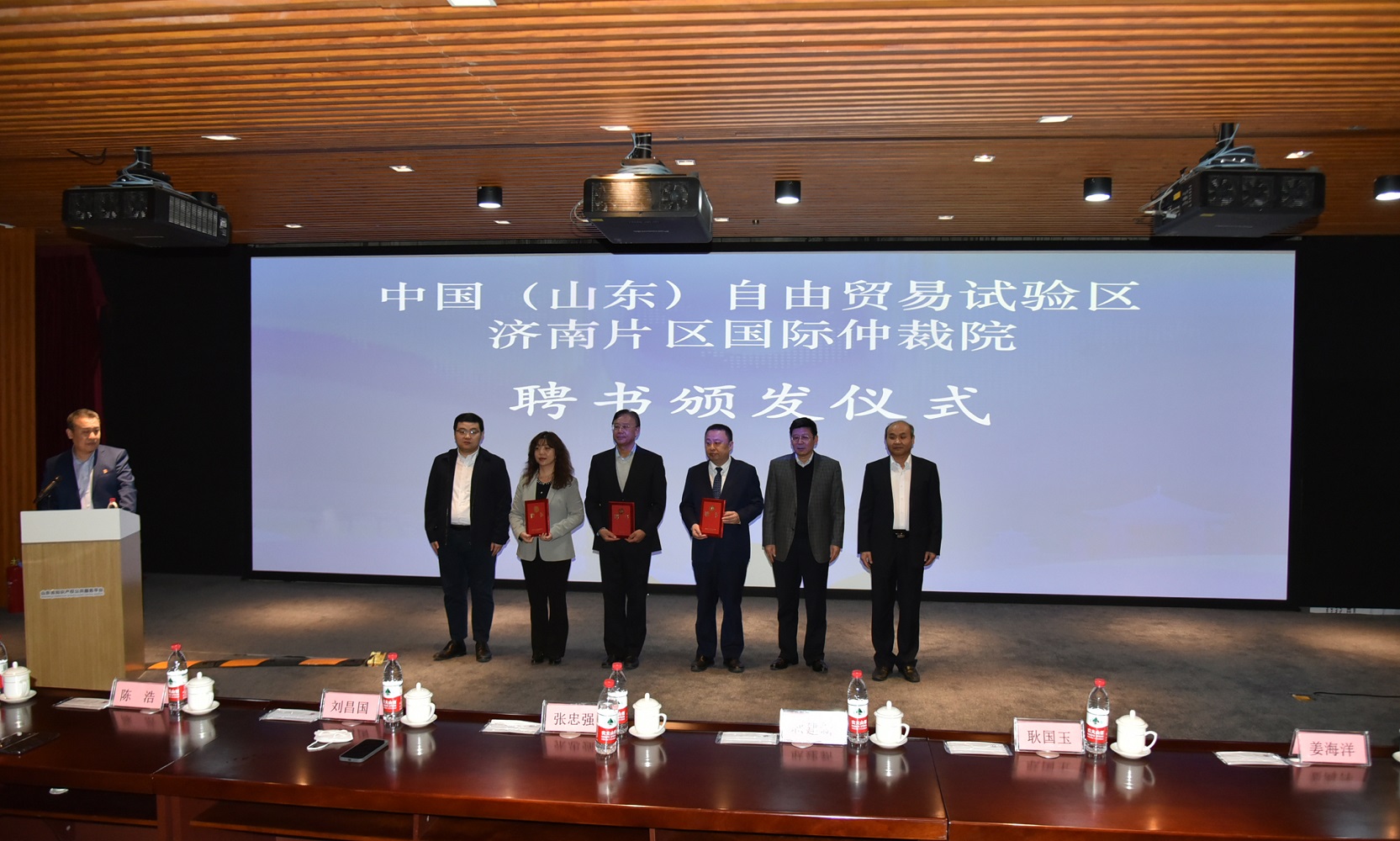 省知识产权事业发展中心、济南仲裁办、济南片区相关负责同志为济南片区国际仲裁院揭牌,并为国际仲裁院组成人员颁发聘书。