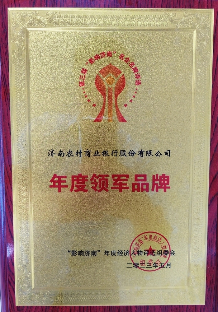 5月19日下午,第三届“影响济南”名企名牌评选暨首届“影响济南”十佳商(协)会评选颁奖活动在济南报业大厦举行,济南农商银行获评“年度领军品牌”。