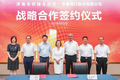 8月10日,齐鲁银行与济南市供销合作社战略合作签约仪式在济南双金大厦齐鲁银行总部举行。