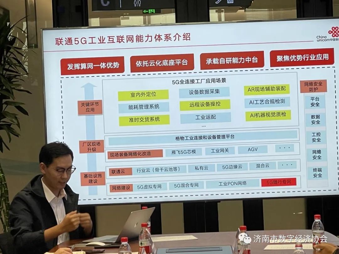 中国联通济南公司工业互联网项目业务主管李晗以“云行齐鲁,工赋泉城”为主题,对济南联通数字化诊断及5G智能工厂方案做了详细介绍,为企业提供了数字化转型诊断服务。济南联通工业互联网项目经理王悦对数字化转型成功的案列做了讲解,澳海炭素5G及工业光网络数字工厂项目实现了企业节能减排,降低生产成本,降低工人劳动强度,绿色发展,形成了炭素行业数字化升级解决方案。
