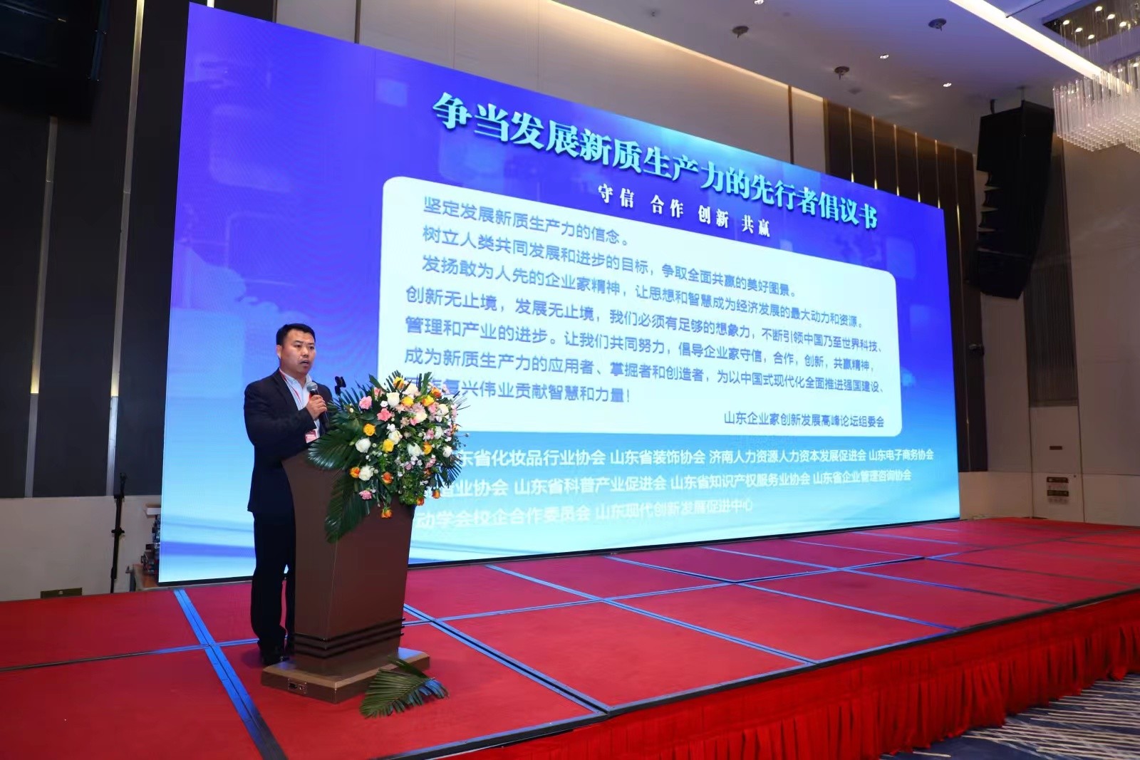 作为主办方山东现代创新发展促进中心、山东会客厅企业服务有限公司成立“实体企业融合协同创新联盟”,围绕实体企业转型与创新发展方向,邀请行业领军企业开展专题分享,聚焦先进制造、工程机械、人工智能、透明质酸、新能源汽车、新材料等领域及发展方向,举办各省级、市级优质商协会创新融合发展战略签约仪式。在高峰论坛现场发起实体企业创新融合发展倡议,提出坚定发展新质生产力和发扬敢为人先的企业家精神等倡议。