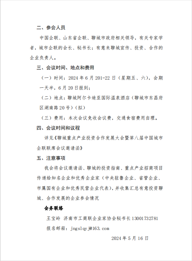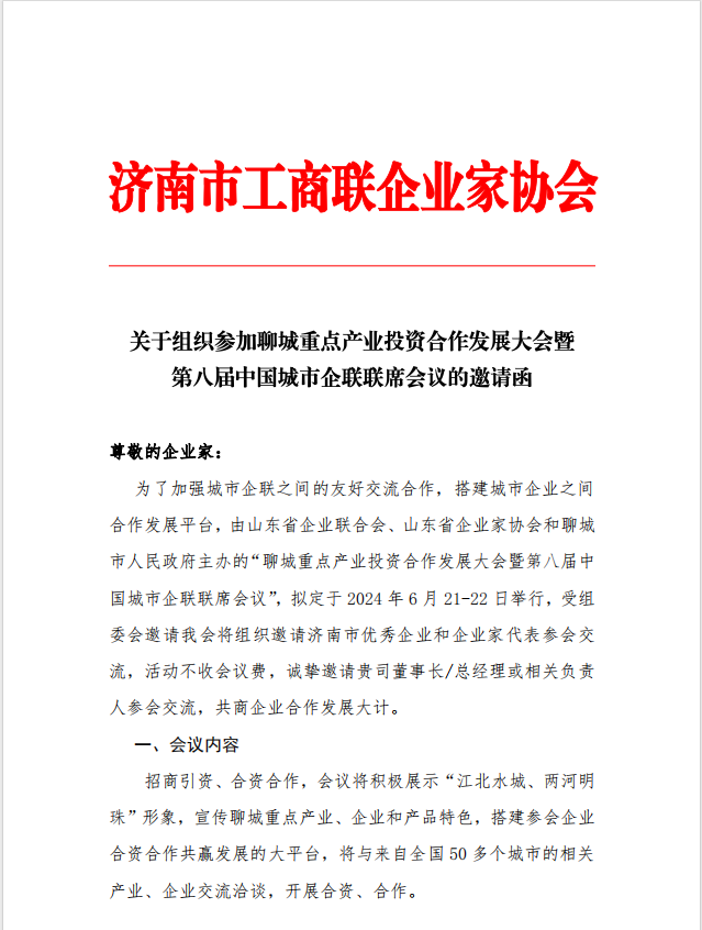 关于组织参加聊城重点产业投资合作发展大会暨第八届中国城市企联联席会议的邀请函