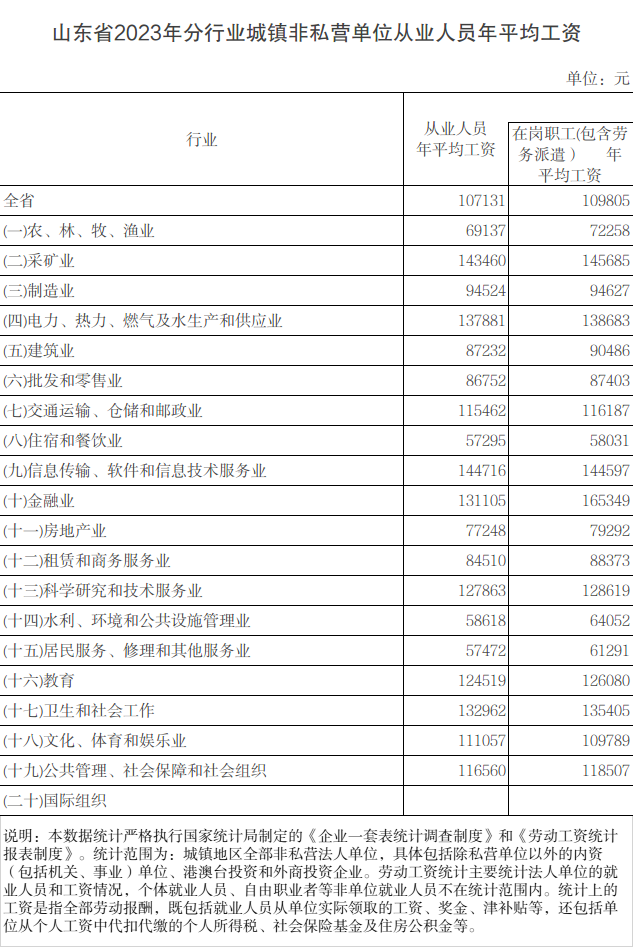 山东省2023年分行业城镇非私营单位从业人员年平均工资