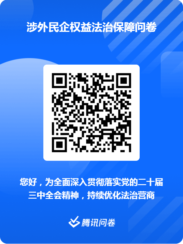 为全面深入贯彻落实党的二十届三中全会精神,持续优化法治营商环境,更好服务涉外企业健康发展,根据市委有关通知要求,市工商联现对我市涉外民营企业权益法治保障现状和存在问题进行调研,商请根据以下提纲内容(见附件),逐条填写有关情况,并于8月15日上午10点前反馈至济南市工商联企业家协会邮箱(jngslqyj@163.com),或扫码填写,联系电话:13001732781。