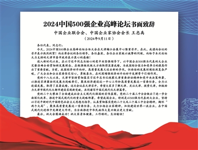 以“向‘新’而行 打造更多世界一流企业”为主题的2024中国500强企业高峰论坛于9月10日—11日在天津举行。十届全国政协副主席,中国企业联合会、中国企业家协会会长王忠禹发来书面致辞。