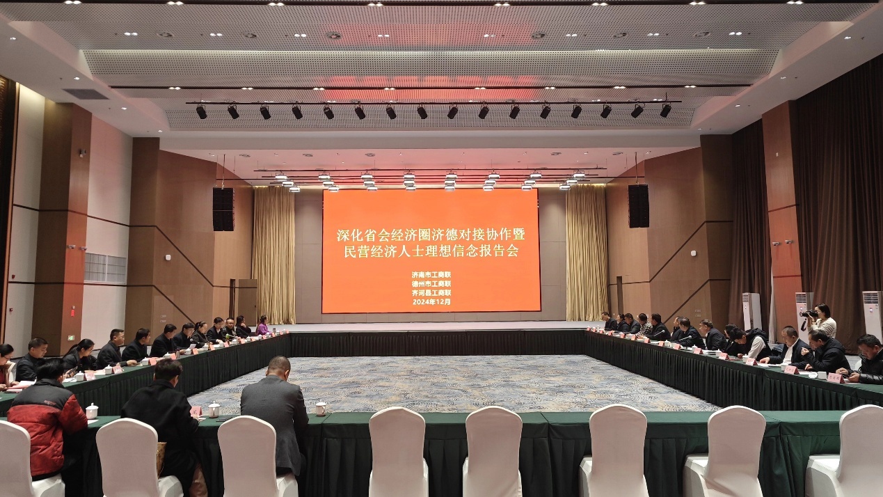 12月10日,济南市工商联、德州市工商联共同举办深化省会经济圈济德对接协作暨民营经济人士理想信念报告会。济南市委统战部副部长、市工商联党组书记张勇出席并致辞,德州市委统战部副部长、市工商联党组书记徐建军主持报告会,省工商联组织建设处处长、驻禹城市省派工作队负责人张志忠陪同有关活动。济南市工商联党组成员、正处级领导干部杨国莉,德州市工商联副主席李华耿,齐河县委常委、组织部部长、统战部部长张志勇,禹城市委常委、统战部部长韩修恒,济南、德州两地企业家代表共40余人参加活动。