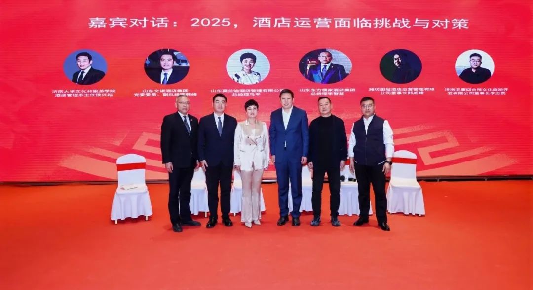 在“2025,酒店运营面临挑战与对策”的嘉宾对话环节,由济南大学文化和旅游学院酒店管理系主任侯兴起主持,山东文旅酒店集团党委委员、副总经理韩峰,山东莫兰迪酒店管理有限公司总经理马平,东方儒家花园酒店总经理李智慧,潍坊图越酒店运营管理有限公司董事长朗咸峰,济南至庸四合院文化旅游开发有限公司董事长李志勇参与了对话讨论。