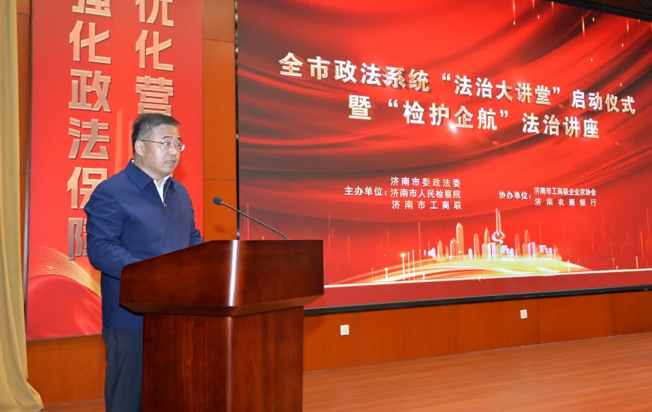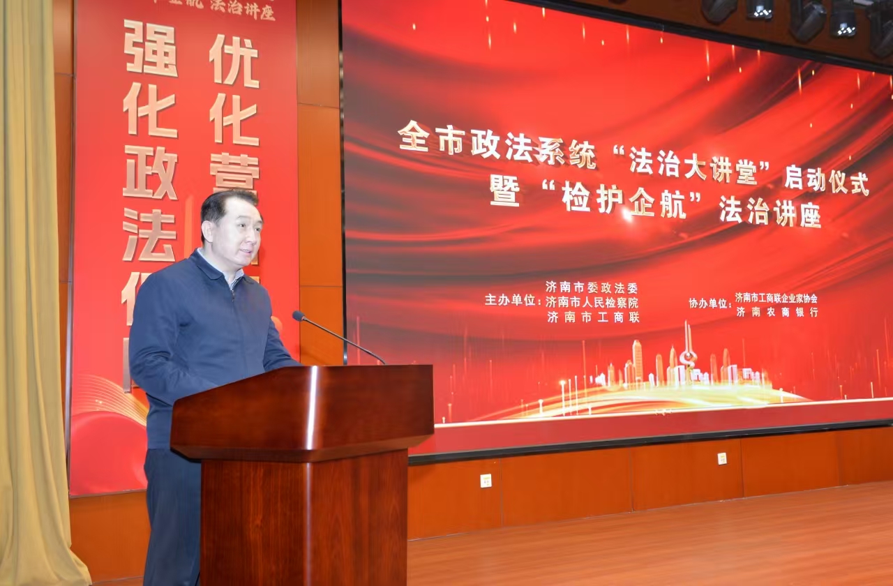 为全力服务保障全市“项目提升年”,化解经营风险,护航项目发展,强化政法保障,优化营商环境,3月28日,济南市政法系统“法治大讲堂”启动仪式暨“检护企航”法治讲座活动举行。本次活动以“企业内部法律风险防控”为主题,市委政法委、市检察院、市工商联主办,市工商联企业家协会、济南农商银行协办。市委常委、政法委书记李国祥出席并致辞,市检察院检察长蒋万云主持。
