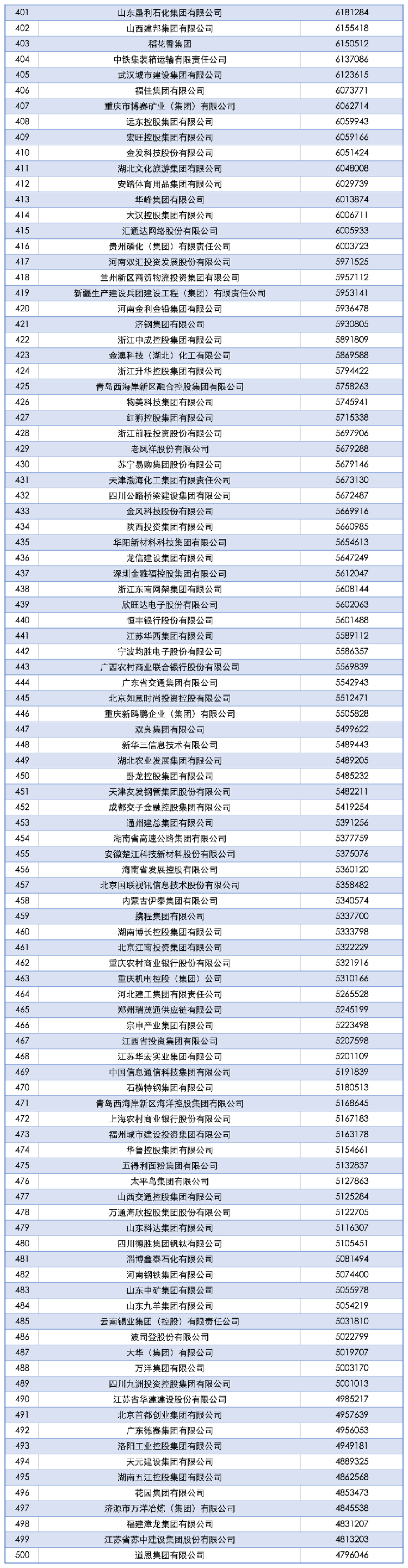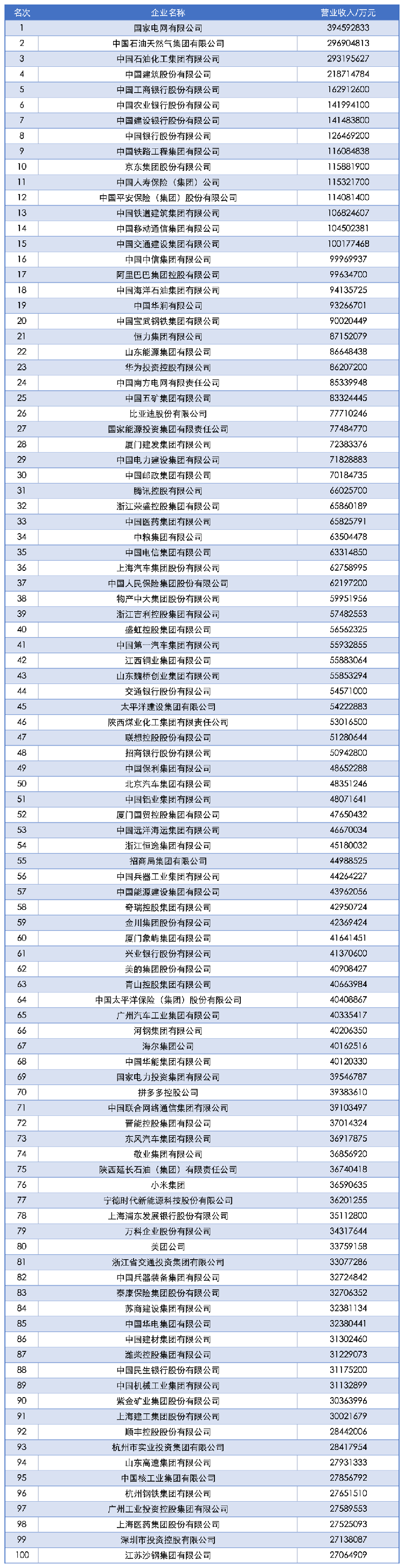 规模总量保持增长。企业500强营业收入达110.15万亿元,较上年500强有所增加。入围门槛实现23连升,达479.60亿元,提升5.79亿元。资产总额为460.85万亿元,增长7.46%。榜单中,千亿规模企业数量增至267家,比上年增加45家,有15家企业的营业收入超过万亿元。其中,国家电网营业收入超过3万亿元,即将突破4万亿元;中国石油、中国石化、中国建筑的营业收入超过2万亿元。